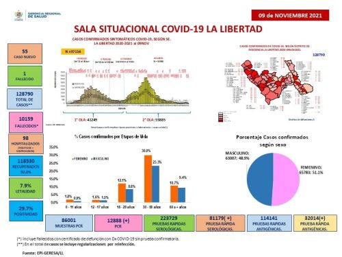 En La Libertad, se conoce por parte de la Gerencia Regional de Salud (Geresa) que desde la fecha del 28 de octubre se han registrado entre 15 y 104 casos de contagios nuevos al día, siendo una tendencia irregular. Si bien existe un aumento, Kerstyn Morote, gerente regional de Salud de La Libertad descartó el comienzo de la tercera ola de la COVID-19 en la región.