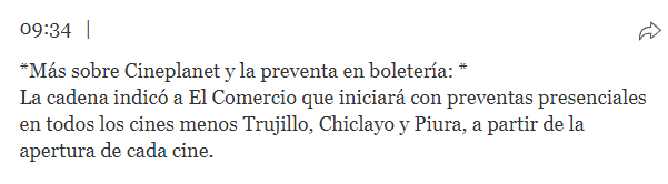 Sin embargo, mediante una nota de El Comercio se pudo encontrar un pequeño fragmento en el cual el director comercial de la cadena Cineplanet, Juan José Duffo, indicó al medio que el inicio de la pre-venta de manera presencial se daría en todos los cines a partir de su hora de apertura, pero exceptuó a los cines de Chiclayo, Piura y Trujillo, con lo cual confirmaba la declaración de la gerenta del Cineplanet de Chiclayo.